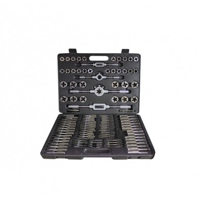 Този комплект метчици и плашки съдържа общо 110 части. Той е необходимост за всички, които работят по своите “напрaви си сам” проекти. Вместо да търсите всеки път нужния метчик или плашка, много по–изгодно е да притежавате целия комплект под ръка. Инструментите са изработени от много здрава въглеродна стомана и за подходящи за извършване на много фини резби. Тази стоманен комплект съдържа всичко необходимо за резбоване. Комплектът се доставя в здрава кутия, с която лесно можете да пренесете всички части.